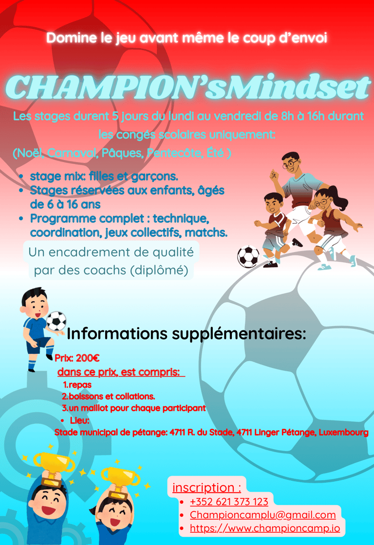 Chez Champion’Mindset, nous organisons des stages de football pendant les vacances scolaires pour les jeunes de 6 à 16 ans. Notre objectif : allier plaisir, apprentissage, discipline et progression, dans un cadre convivial et professionnel..